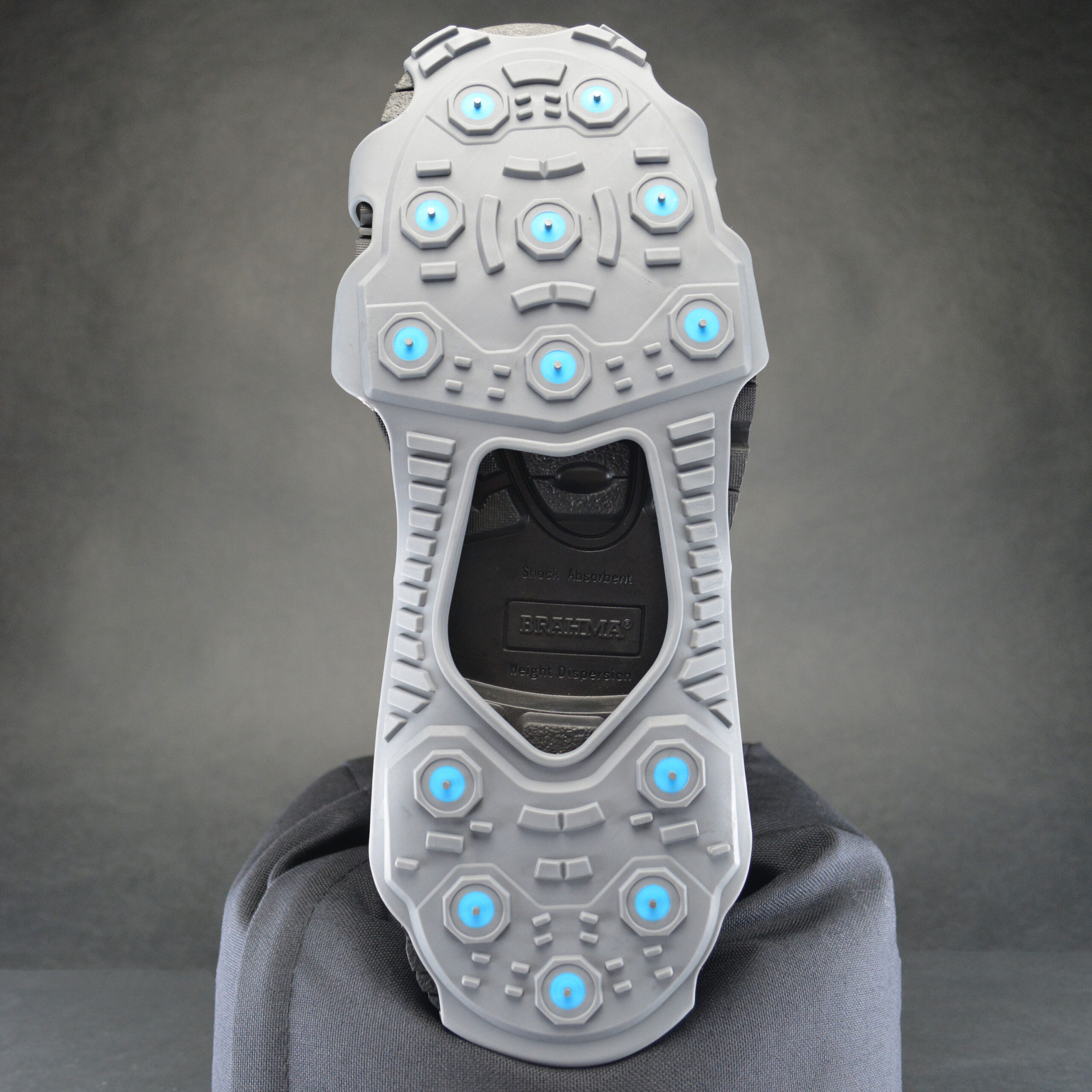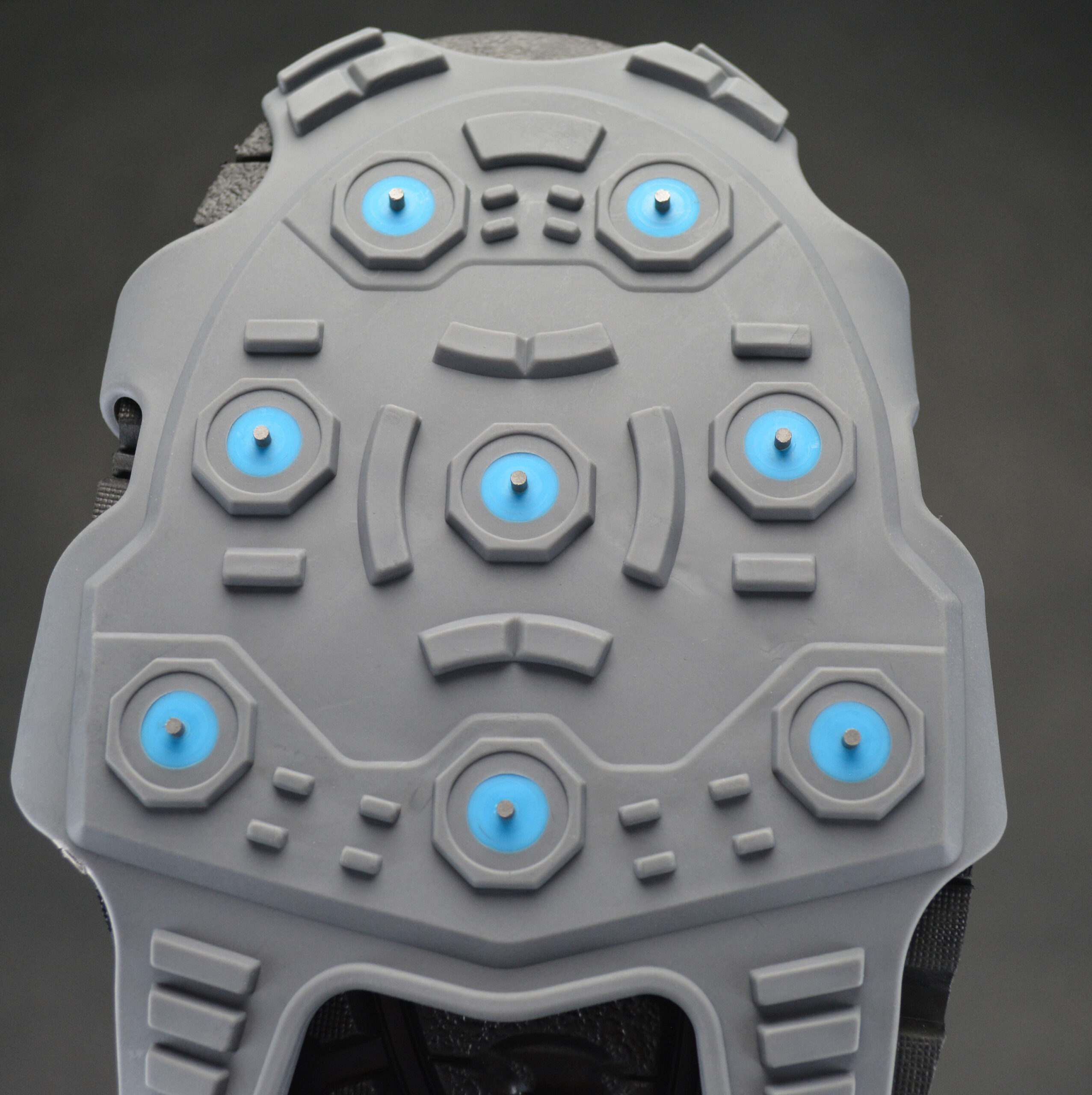 The traction comes from 26 aggressively exposed, or “high-profile,” tungsten carbide studs. The tungsten carbide studs are molded in for maximum durability and allow employees to walk confidently in harsh winter conditions.